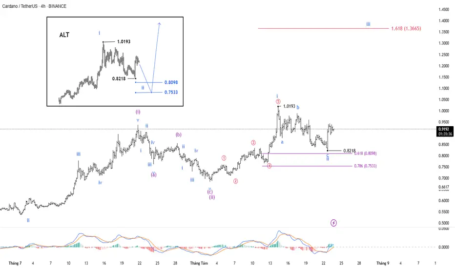 Nếu giá giữ được trên 0.8218 và tiếp tục phá đỉnh 1.0193, ADA sẽ xác nhận bước vào sóng iii xanh.