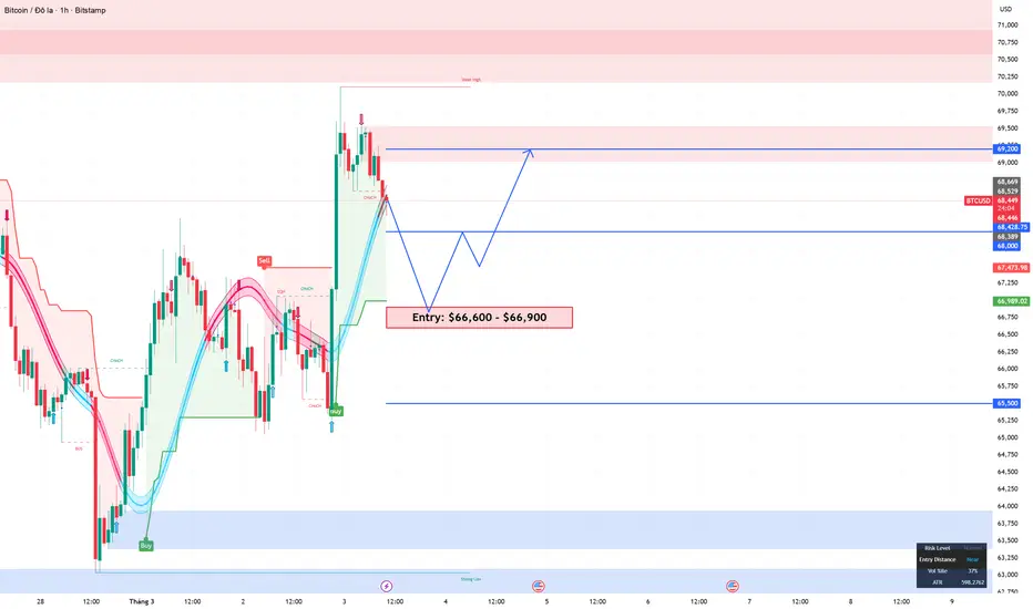 Entry (Vào lệnh) $66,600 – $66,900 (vào lệnh ngay sau nến xác nhận)