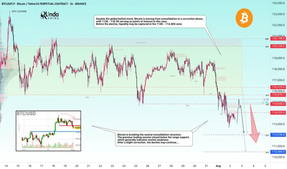 The fundamental background is shifting to neutral, the hype has temporarily ended, and there are no bullish drivers yet. And for the health of the market, a correction is needed. Bitcoin is breaking the neutral consolidation structure. The previous trading session closed below the support range, which generally indicates market weakness. Despite the global bullish trend, Bitcoin is moving from consolidation to a correction phase, with 112K - 110.5K serving as points of interest in this case. Before the fall, liquidity may be captured in the 114K - 114.800 zone.