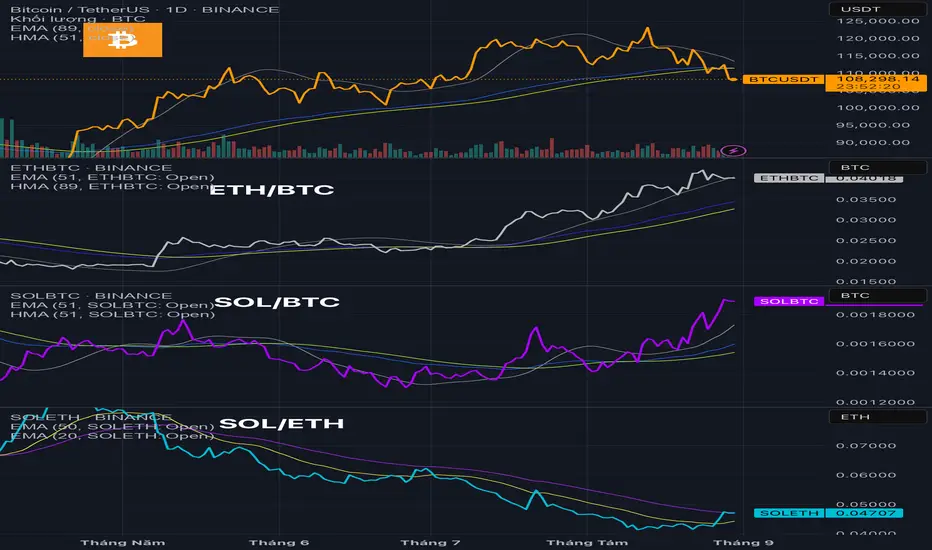• Cặp SOL/BTC: Rất mạnh, đã breakout khỏi EMA và duy trì tăng tốc.