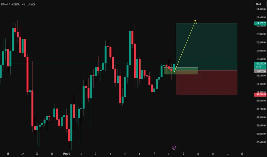 View chính: Canh Buy BTC quanh vùng hỗ trợ 111,070 – 111,100, mục tiêu hướng lên 113,300+.