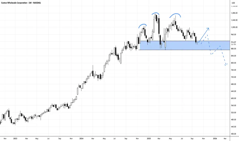 Costco (COST) has posted another strong fiscal year, with revenue climbing to $86.2B and net income up to $5.49B. However, the weekly chart is showing a developing head-and-shoulders pattern threatens the upside momentum, and price must hold above 871 with a rejection candle this week to avoid a deeper breakdown. A close below that level could confirm bearish continuation, despite Costco’s solid fundamentals.