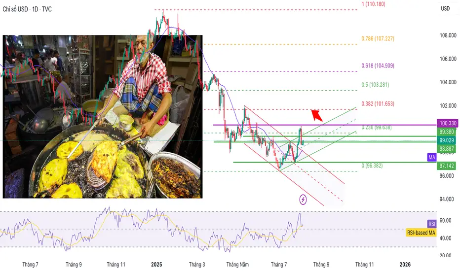 Đối với trường hợp Dxy giảm xuống dưới EMA21 cũng là lúc nó quay trở lại với kênh giá (a), điều này sẽ là một tín hiệu tiêu cực về mặt kỹ thuật khi nó đánh dấu Dxy phá vỡ dưới cả kênh giá tăng (b) và mức hỗ trợ Ema21. Điểm đến tiếp theo trong trường hợp này là mốc 97.142 trong ngắn hạn, nhiều hơn là mức 96.382.