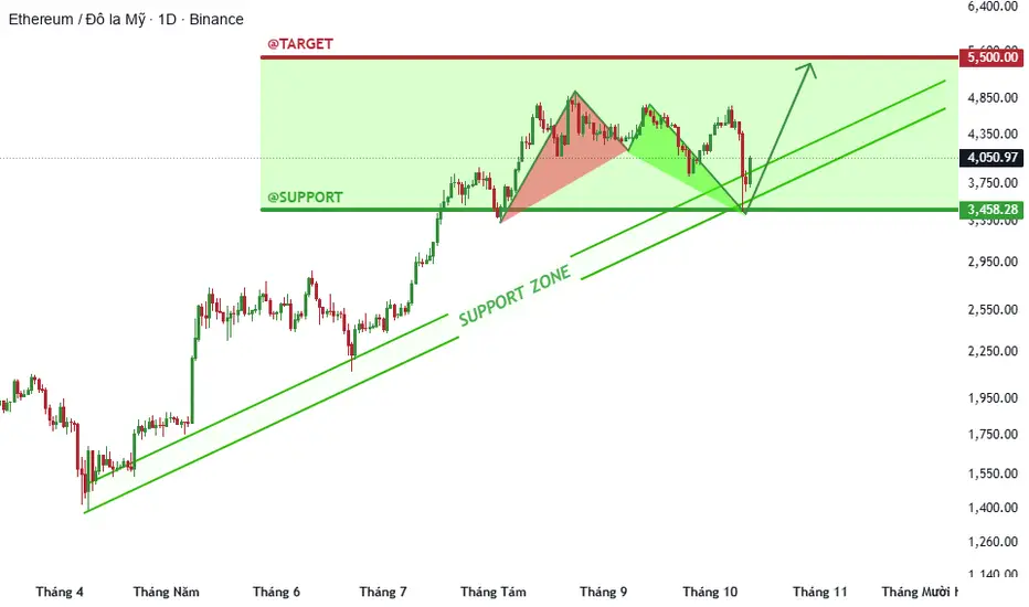 ETH cực ngon này xem có gì hay ho không nhé. Trên khung thời gian D1, cặp ETH/USDT vừa có một cú điều chỉnh về vùng hỗ trợ cực kỳ mạnh mẽ quanh mức 3,450 USD. Điều đáng chú ý là vùng giá này trùng khớp với đường kênh xu hướng tăng dài hạn đã được thiết lập (SUPPORT ZONE) và một đường hỗ trợ ngang vững chắc. Sự bật nảy mạnh mẽ từ khu vực này cho thấy lực mua đang quay trở lại một cách rõ rệt. Chúng ta cần theo dõi chặt chẽ vùng kháng cự tiếp theo quanh 4,800-5,000 USD, và nếu phá vỡ thành công, mục tiêu xa hơn là 5,500 USD như đã thể hiện trên biểu đồ. Mức hỗ trợ quan trọng nhất hiện tại vẫn là 3,450 USD.