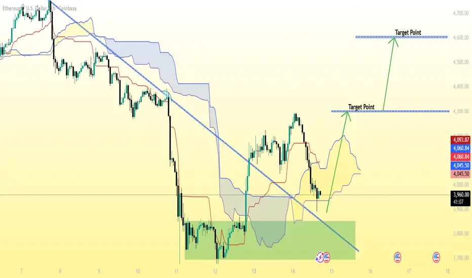 Ethereum (ETH/USD) 1-hour chart from Coinbase, with Ichimoku Cloud and a downtrend breakout drawn — here’s the clear target breakdown: