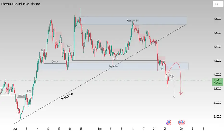 🔹 Support & Resistance Zones – After the breakdown, ETH retested the previous support area (now acting as resistance). Sellers stepped in strongly, and the rejection suggests continuation to the downside.