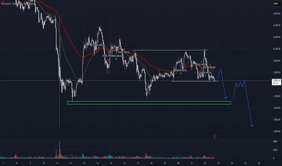 Ethereum hiện đang test vùng hỗ trợ trigger 3822.5. Sau cú giảm mạnh, không xuất hiện lực hồi, cho thấy phe mua đang yếu thế. Thị trường đang tích lũy ngay tại vùng hỗ trợ, điều này càng làm tăng khả năng phá hỗ trợ.