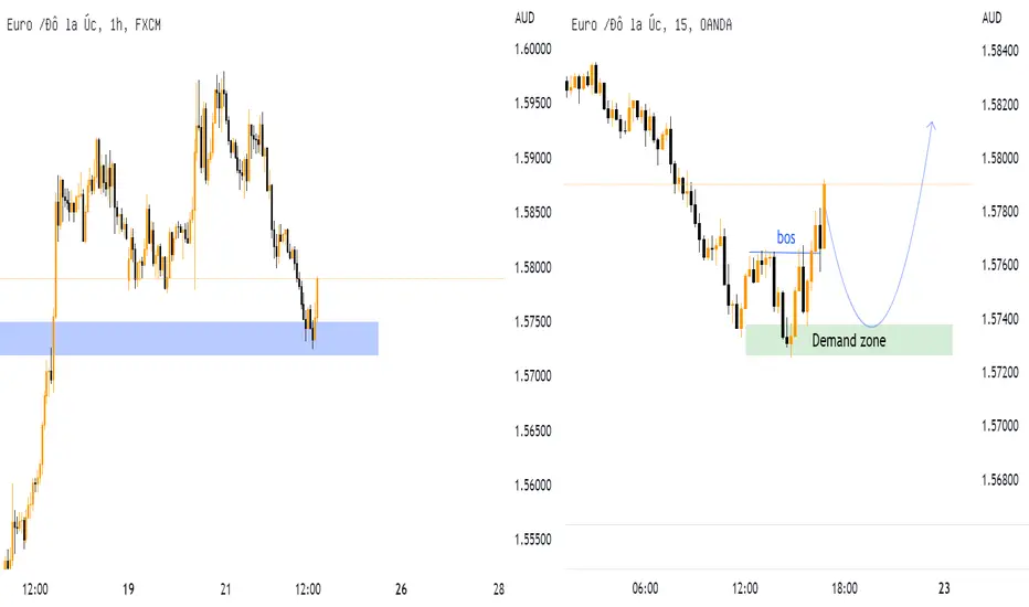 Hiện tại EURAUD tạo xu hướng tăng. Giá hồi về vùng đỉnh cũ của khung H1, trong khung m15 giá đã BOS -> Đồng qua hai khung thời gian.