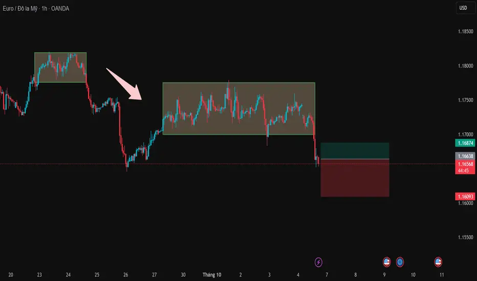 Hiện tại, EUR/USD đang có diễn biến giảm mạnh sau giai đoạn tích lũy trong vùng giá 1.1720–1.1760 (khu vực tích lũy trung hạn). Trước đó, cặp tiền này đã gặp áp lực giảm mạnh từ vùng 1.1800, hình thành một cú phá vỡ rõ ràng xuống dưới hỗ trợ ngắn hạn.