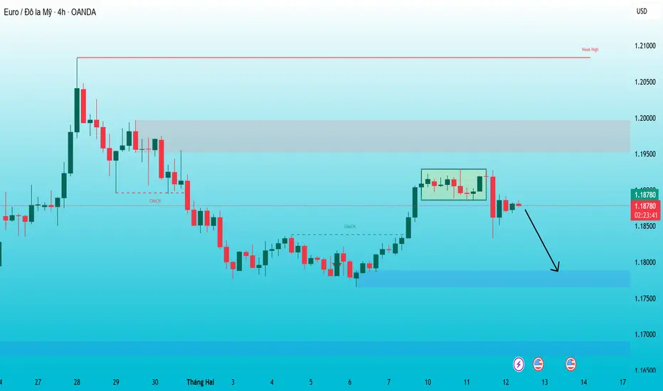 EURUSD đã gãy range 4H, xác suất cao giá sẽ hồi lên retest vùng 1.1888–1.1915 rồi tiếp tục giảm.