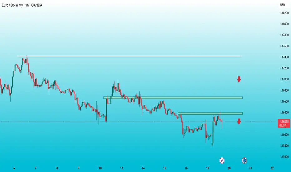 EURUSD khung 1H hôm nay: Xu hướng giảm vẫn chiếm ưu thế, canh Sell tại vùng cung 1.1640–1.1668