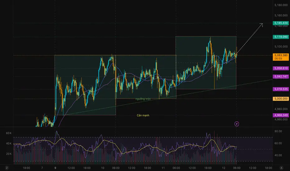 Khung M15: Xu hướng tăng ngắn hạn vẫn được giữ khi giá nằm trên MA20 & MA50. Cấu trúc: Higher High – Higher Low duy trì. Giá hiện đang tích lũy trên 5070–5085, nếu giữ vững vùng này, khả năng tiếp tục test đỉnh 5,119 là cao. RSI đang hồi phục lên vùng 50, ủng hộ xu hướng tăng.