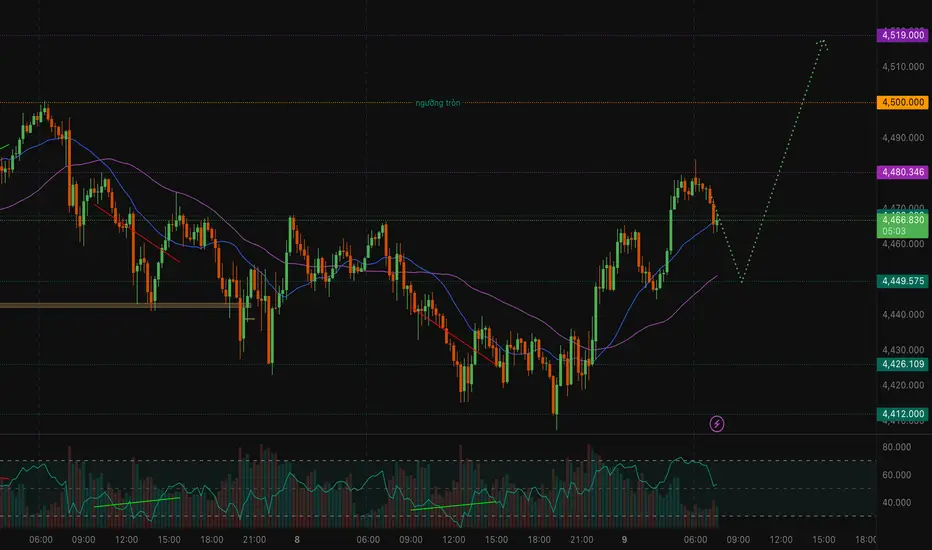 - Giá chạm hỗ trợ 4.450 - 4.427 - 4.412 (bật lại kèm nến M5 xác nhận)