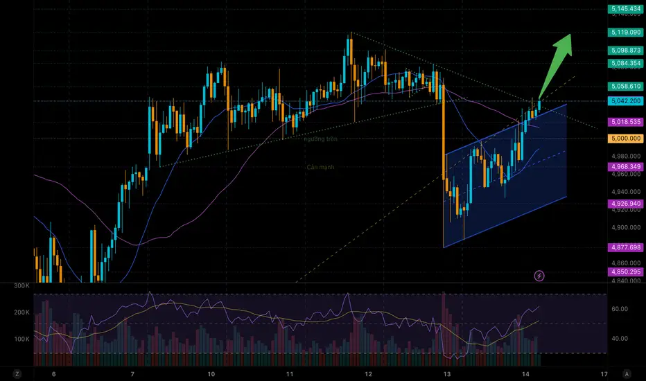 Khung H1: Giá đang phá cạnh trên của mô hình tam giác giảm. Cấu trúc ngắn hạn: Tạo đáy sau cao hơn đáy trước (Higher Low). MA20 đang hướng cắt lên MA50, tín hiệu ủng hộ xu hướng tăng ngắn hạn. RSI hồi lên vùng 60, động lượng tích cực nhưng chưa quá mua. Nếu giữ vững trên 5042, khả năng cao vàng tiếp tục test 5119.