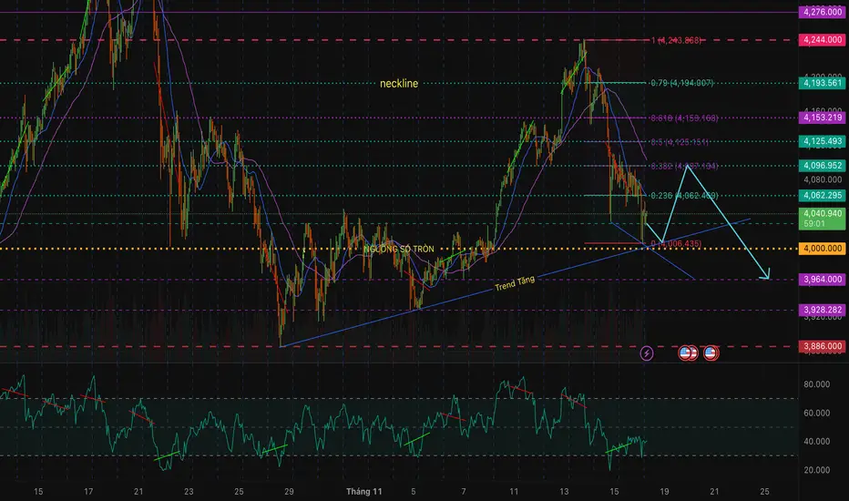 • Thủng 4,000 → mục tiêu tiếp theo: 3,964 (điểm hội tụ Fibo + đường cầu dài).