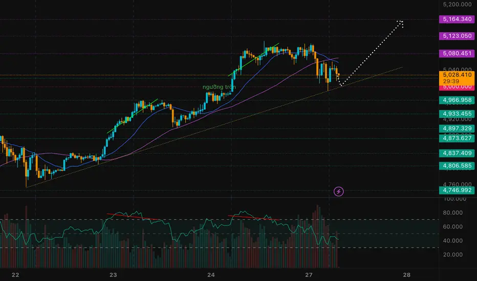 - Giá chạm hỗ trợ 5.000 - 4.966 - 4.933 (bật lại kèm nến M5 xác nhận)