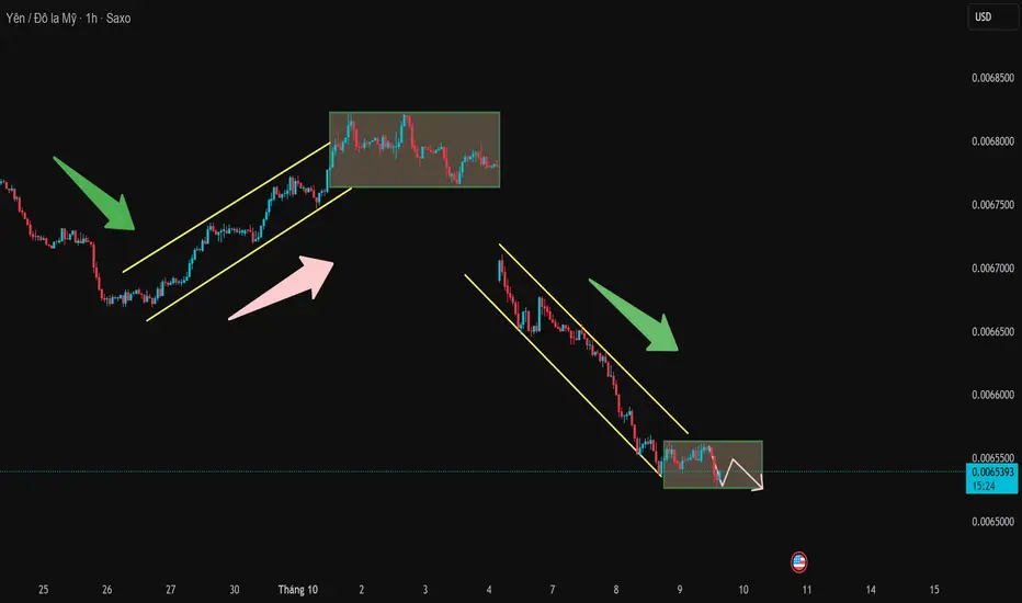 Cặp tỷ giá JPY/USD trên khung H1 đang duy trì cấu trúc giảm rõ rệt sau khi phá vỡ kênh tăng trước đó. Giá hình thành chuỗi Lower High – Lower Low, cho thấy phe bán vẫn chiếm ưu thế trong ngắn hạn.