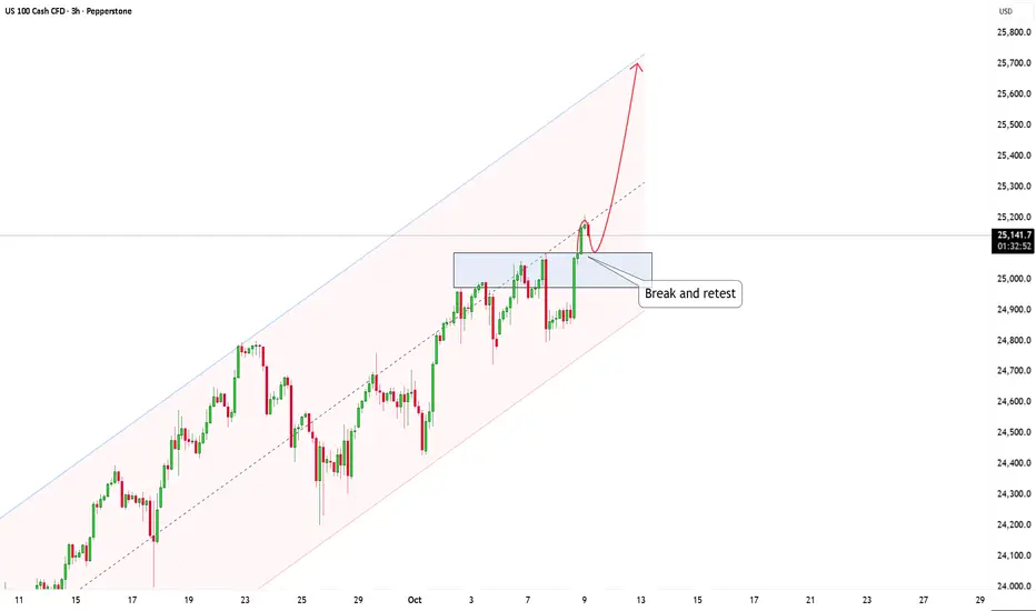 Let's take a closer look at the NAS 100 on a 3-hour timeframe, as it’s currently showing some interesting movements. The price has been steadily moving within an ascending channel, with the buyers continuing to dominate and push the price higher.