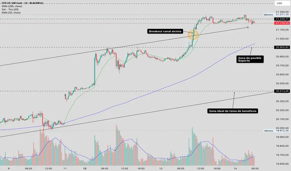 NAS100, realizo un breakout de canal alcista como lo pueden ver en el grafica, parece estar mostrando algo de cansancio probablemente para retomar fuerzas para seguir su camino al alza, para cortos pensaría luego de romper a la baja la zona de 20.900$ que es la media móvil de 200 la azul en la grafica y altos y bajos mas bajos asegurando las probabilidades a favor la toma de beneficios ideal seria la zona de 20.400$ que se encuentra dentro de la parte baja dentro del canal alcista aunque dudo que llegue a esa zona, para largos pensar en caso de romper los 21.300$ al alza con volumen y altos y bajos mas altos.