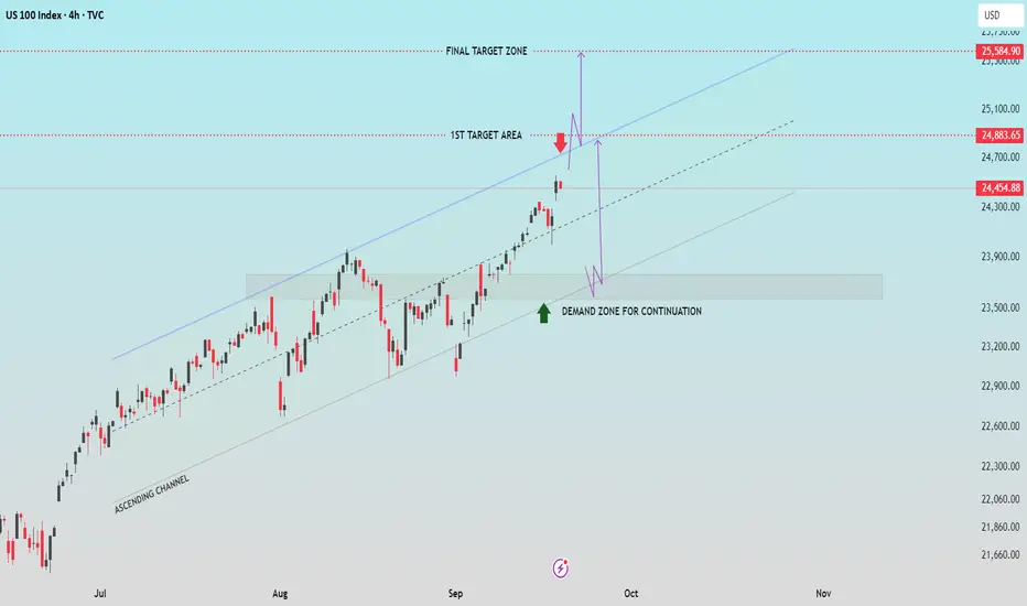 The US100 Index remains in a strong uptrend inside the ascending channel. The 24,880 resistance is the short-term hurdle, while the 23,500 demand zone remains a key level for potential continuation. The bullish structure remains intact unless the demand zone breaks.