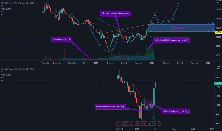 Thỏa vài điều kiện cơ bản của Canslim và đã phá vỡ mô hình nền giá phẳng trên tháng với nến power candle và trước đó là nến bao trùm tăng và mô hình thu hẹp biến động kinh điển của bậc thầy Mark Minervini trên tuần với khối lượng giao dịch cao cho thấy quỹ lớn đã tham gia (khả năng sẽ kiểm chứng lại vùng cầu trước khi breakout phá đỉnh cũ đi tiếp):