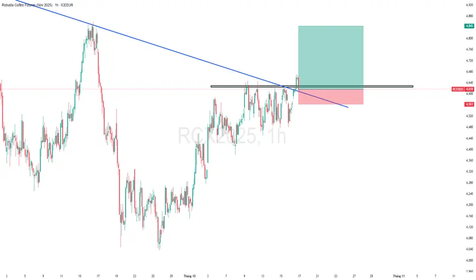 Giá Robusta đã phá vỡ đường trendline giảm dài hạn, đồng thời retset vùng kháng cự cũ 4,610 – 4,620.