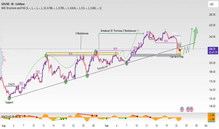 The chart highlights a clear break of structure (BOS) and multiple trendline rejections forming a strong base of support. After the accumulation phase, SOL has completed its correction and is now showing signs of a bullish reversal.