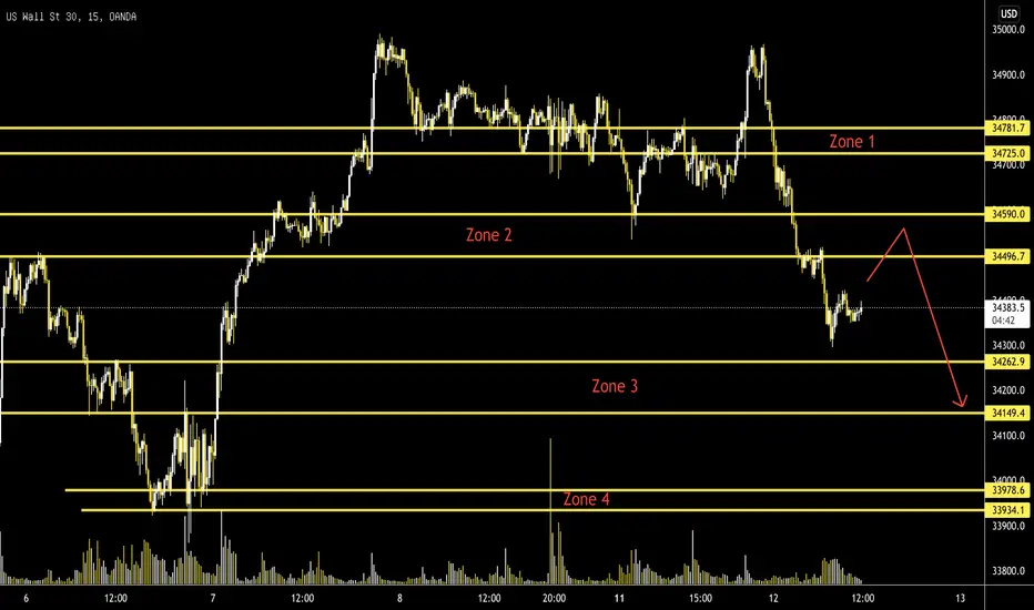 US30 hôm nay đã quay trở lại xu hướng giảm ngắn hạn, canh Sell ở Zone 2, nếu thủng Zone 2 thì dừng lại quan sát. Chờ thủng luôn Zone 1 thì sẽ tăng.