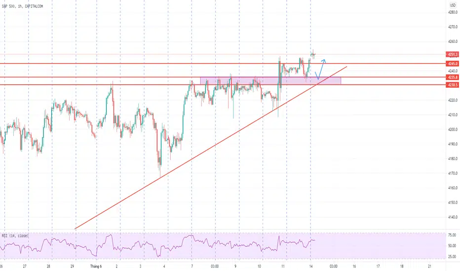 S&P 500 tiếp tục chờ hồi về để Long thuận theo xu hướng sau khi lập đỉnh cao nhất mọi thời đại 4250. Vùng support chờ hồi về ở 4225-4235