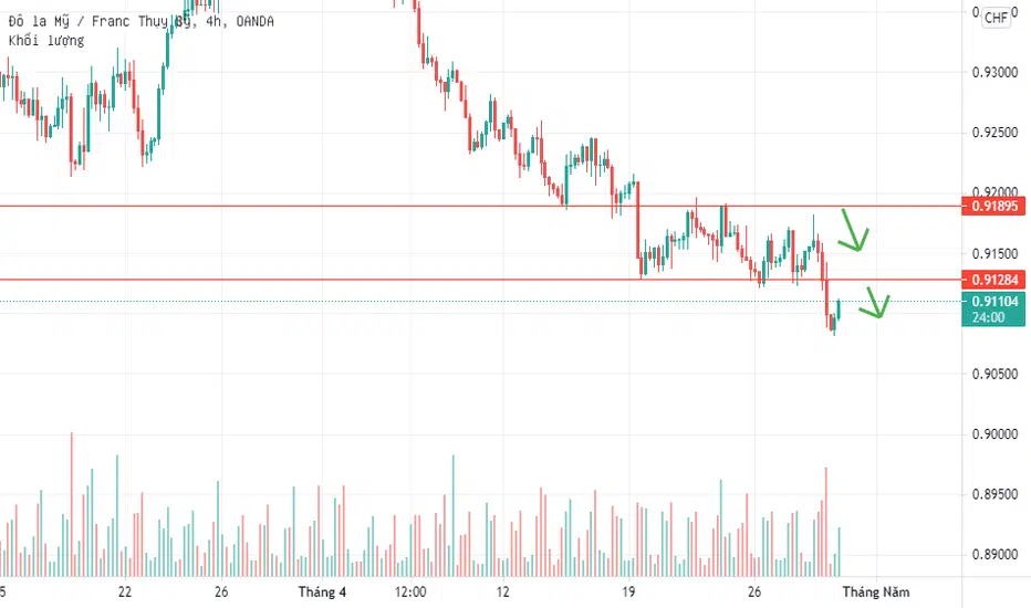 USDCHF có một phiên giảm giá quan trọng do sự mất giá của đồng USD. Vậy là vùng giá đi ngang nhiều ngày trước đó đã bị phá bỏ. Đây là tín hiệu cho một xu hướng giảm mới. Chúng ta kì vọng giá hồi về vùng đáy cũ bên trên 0.912 để bán xuống.