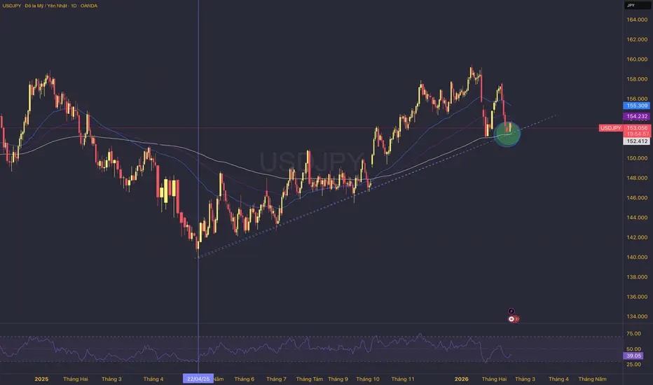 Tôi nhận thấy USDJPY đang kiểm định đường xu hướng duy trì từ tháng 4/2025. Đồng thời kiểm tra EMA200. Đáng chú ý là hai đợt giảm mạnh rất tiêu cực trên cặp tiền tệ này cho thấy tại vùng tỷ giá hiện tại, USDJPY đang bị canh bán rất mạnh.