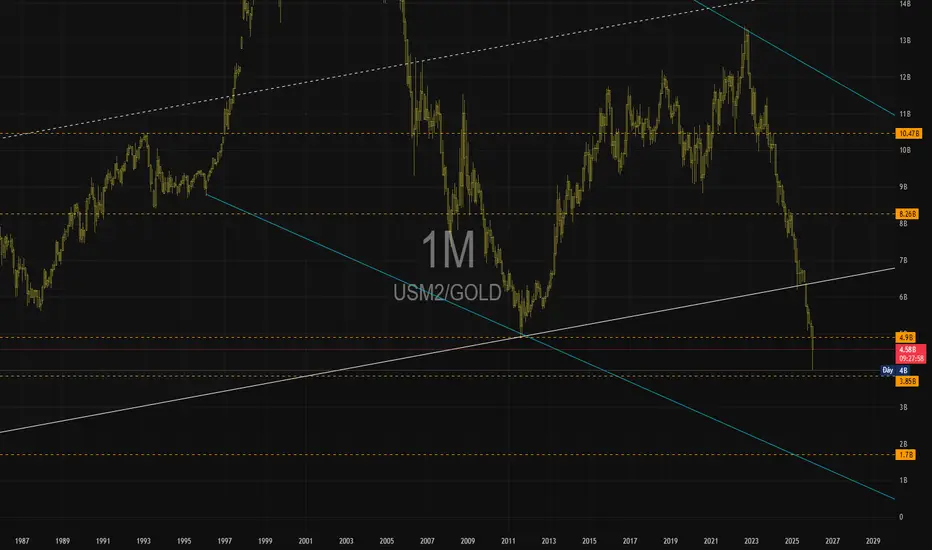 Tỷ lệ cao (Đỉnh): Thường xuất hiện khi lượng tiền in ra quá nhiều nhưng giá vàng chưa tăng kịp. Đây là dấu hiệu vàng đang định giá thấp (undervalued) so với cung tiền.
