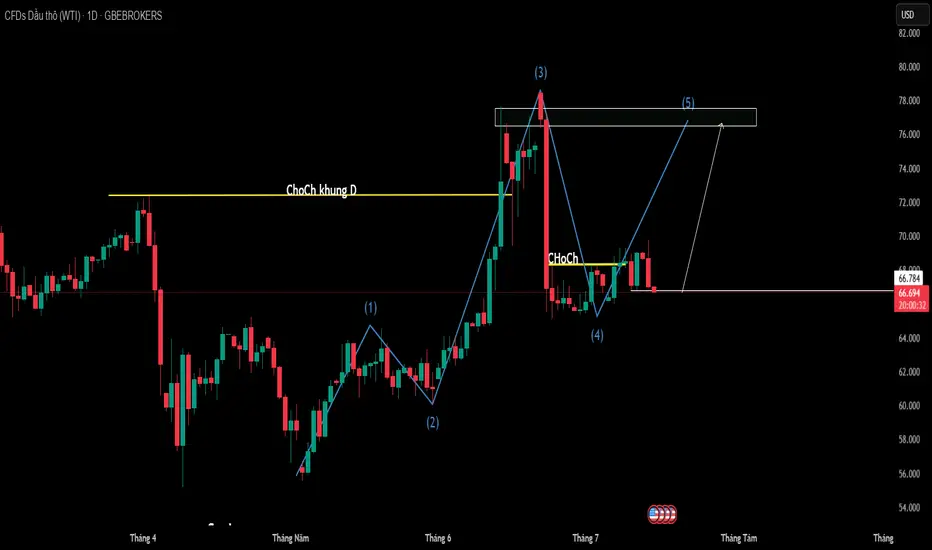 Sóng 4: Điều chỉnh giảm về vùng giá 66-67 USD, đồng thời tạo ra Change of Character (ChoCh) ngắn hạn nhưng không phá vỡ cấu trúc tăng tổng thể.