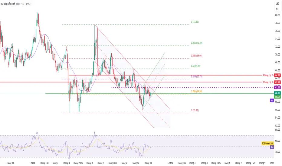 • Xu hướng thị trường: phục hồi ngắn hạn trong xu hướng giảm trung hạn. Giá WTI hiện giao dịch quanh ~60.2 USD/thùng, vừa bật khỏi vùng đáy ngắn hạn và đang chạy trong một kênh tăng nhỏ (xanh) nằm trong khuôn khổ một kênh giảm lớn (đỏ).