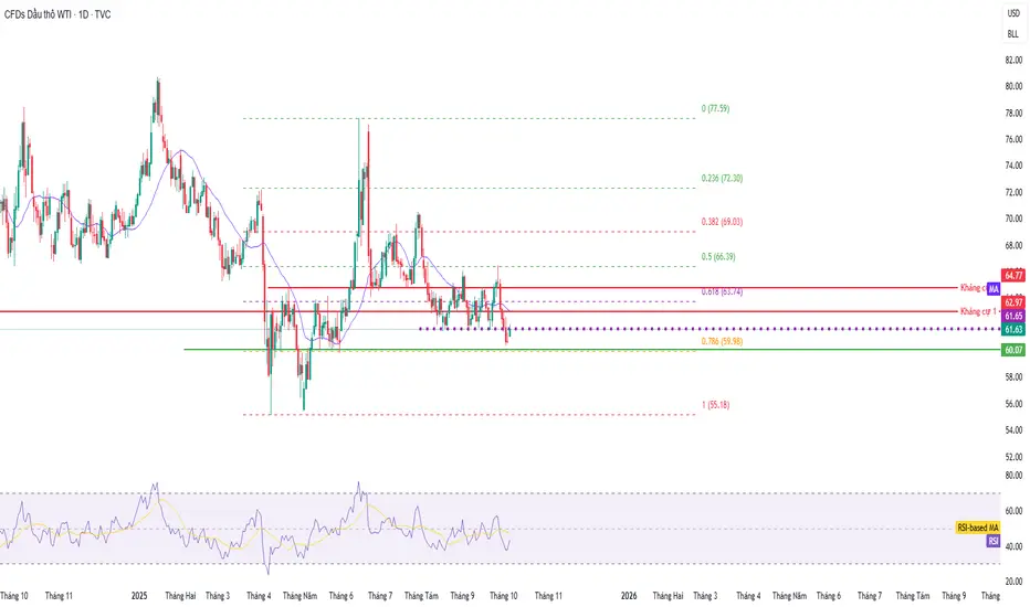 Đây là nhịp hồi kỹ thuật trong xu hướng trung hạn vẫn yếu. Nếu giá không giữ được vùng 60 USD, khả năng cao WTI sẽ mở rộng đà giảm về 55–56 USD (Fibo 1.0).