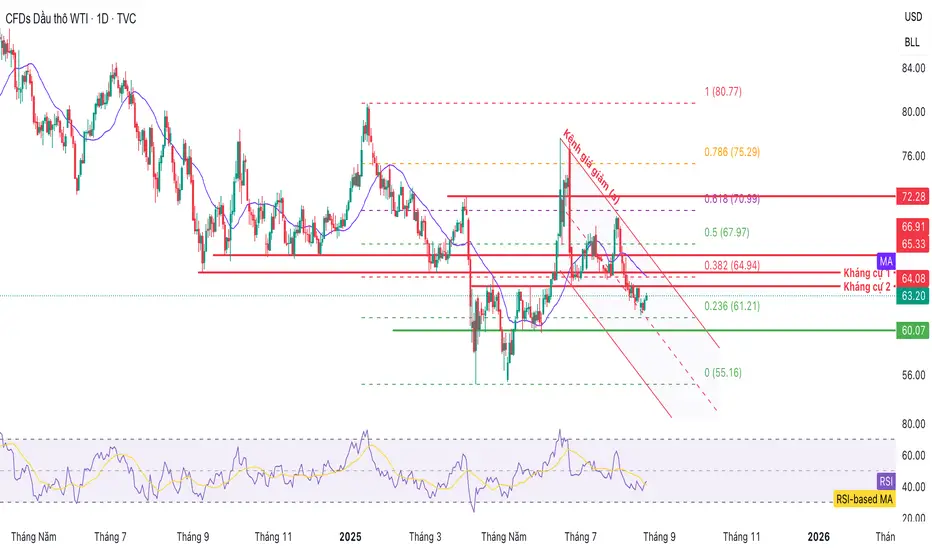 Mặt khác, dầu thô WTI cũng chịu áp lực từ EMA21 làm áp lực chính, gần nhất là mức 64USD (Kháng cự 2) sau đó là điểm kỹ thuật của Fibonacci thoái lui 0.382% và (Kháng cự 1).