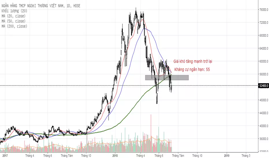 Giá vẫn đang nằm dưới các đường trung bình quan trọng cho thấy rủi ro vẫn đang ở mức cao. Kháng cự ngắn hạn là vùng giá 54-55. Nhóm cổ phiếu ngành Ngân hàng mang tính thị trường rất cao. Do đó, tiếp tục cảnh báo rủi ro với nhóm cổ phiếu này. Khuyến nghị không mua ở thời điểm này.