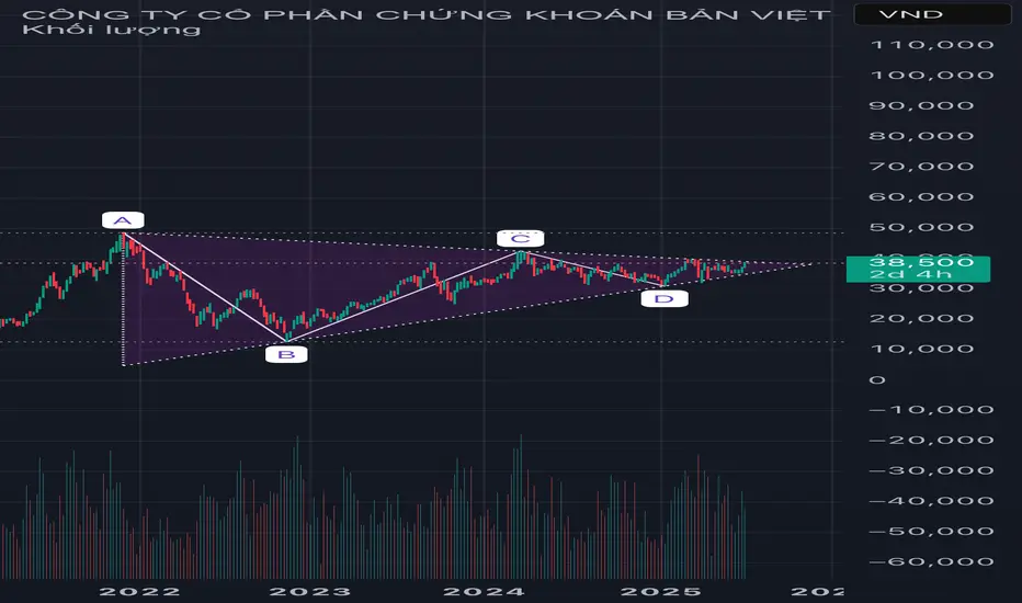 VCI đang trong giai đoạn cuối của mô hình tam giác hội tụ kéo dài từ giữa 2022 đến nay. Giá đang tích lũy và có thể sắp phá vỡ mô hình.