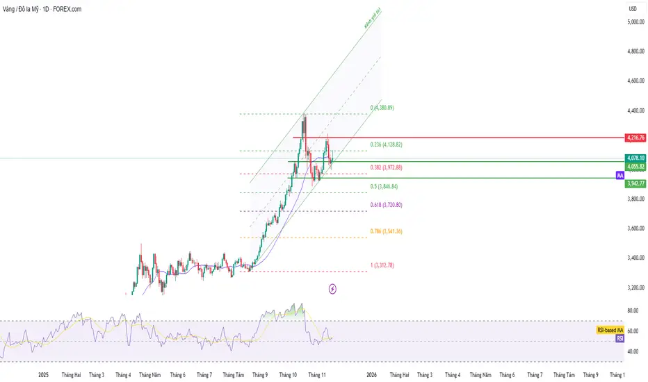 Sau nhịp hồi phục từ vùng đáy quanh 4,000USD, giá vàng đã chạm đúng Fibonacci thoái lui 0.236 tại 4,128 USD và lập tức bị từ chối, cho thấy lực bán chốt lời vẫn còn hiện diện mạnh.