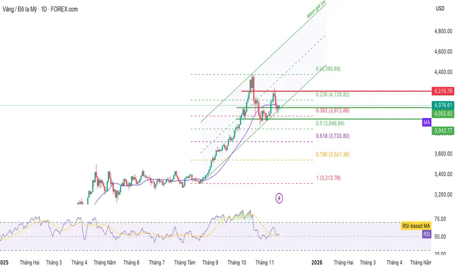 Cấu trúc giá vẫn duy trì trong kênh tăng kể từ tháng 8, nhưng động lực đã yếu hơn đáng kể sau khi giá hai lần thất bại trước vùng kháng cự mạnh 4.216 USD/ounce (Fib 0.236). Mức 3.972–3.990 USD/ounce (Fib 0.382) tiếp tục đóng vai trò là vùng đệm quan trọng, và việc giá không phá vỡ vùng này trong nhịp giảm vừa qua là một tín hiệu tích cực.