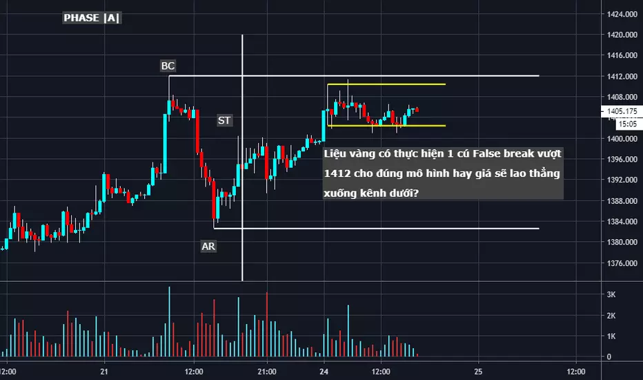 Vàng sau khi tăng rất mạnh mẽ trong mấy ngày qua đã có 1 nhịp giảm mạnh và đẩy xu hướng vào giai đoạn sideway. Hiện tại theo mô hình Phân phối của Wyckoff, mình kỳ vọng giá sẽ thực hiện Upthrust Action false break vùng 1412 và giảm thẳng về kênh dưới. Sell limit 1414 là lệnh chờ, SL 50 pip, 50% khối lượng tiêu chuẩn. Nếu thực sự false break thể hiện qua việc giá quay trở lại trading range ngay lập tức thì mình sẽ vào thêm.