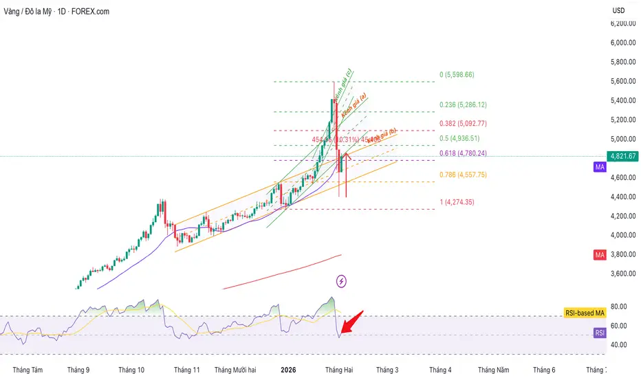 Sau chuỗi giảm mạnh và giàu tính “thanh lọc”, giá vàng đang cho thấy dấu hiệu phục hồi đáng kể, cả về mặt giá lẫn động lượng. Trên khung ngày, giá đã bật lên dứt khoát từ vùng Fibonacci 0.786, đồng thời lấy lại mốc 0.618, một khu vực kỹ thuật then chốt từng đóng vai trò hỗ trợ và kháng cự trong suốt nhịp tăng trước đó.
