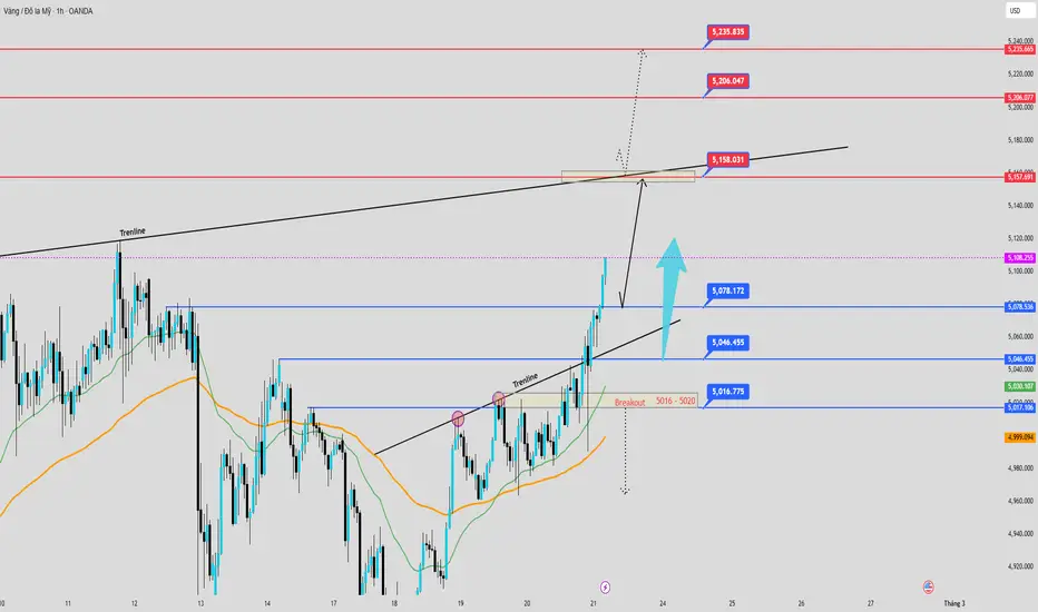 - Nếu giá breakout vùng (5158 - 5160) + phá trenline tăng (H1) thì view BUY tiếp diễn.