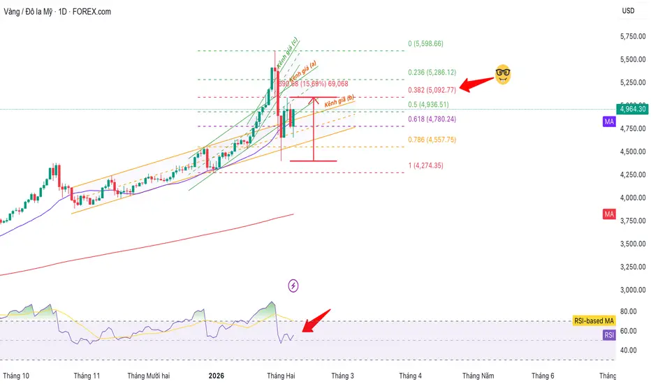 Về cấu trúc giá, vàng đã rơi khỏi kênh tăng dốc (kênh giá a) sau cú điều chỉnh mạnh đầu tháng 2, nhưng chưa phá vỡ cấu trúc xu hướng tăng trung hạn. Hiện tại, giá đang dao động trong kênh giá hồi phục (kênh b), một dạng điều chỉnh mang tính kỹ thuật, thường xuất hiện giữa các nhịp tăng lớn.