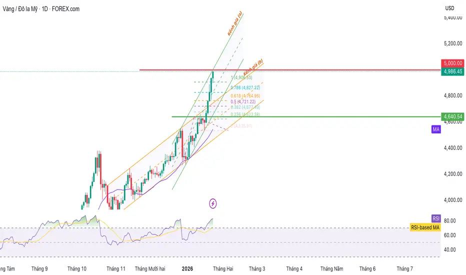 Mốc 5.000 USD/ ounce hiện đóng vai trò là kháng cự ngang gần nhất, đồng thời là vùng tâm lý tròn số, nơi áp lực chốt lời ngắn hạn có thể xuất hiện sau một nhịp tăng dốc. Việc giá tiếp cận vùng này trong trạng thái RSI duy trì trên vùng trung tính cao, tiệm cận khu vực quá mua, làm gia tăng xác suất xuất hiện một đợt điều chỉnh kỹ thuật mang tính “hạ nhiệt”, thay vì đảo chiều xu hướng.