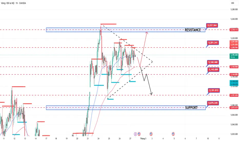 Vùng 5,201 – 5,237 tiếp tục là kháng cự quan trọng phía trên. Nếu giá phá vỡ cạnh trên của tam giác và đóng cửa thuyết phục trên 5,210, động lượng tăng có thể được kích hoạt lại với mục tiêu hướng về 5,237 và xa hơn là vùng cung 5,30x. Ở chiều ngược lại, nếu giá phá vỡ cạnh dưới của mô hình và đánh mất khu vực 5,145 – 5,160, áp lực bán có thể gia tăng, kéo giá về 5,101 và sâu hơn là vùng hỗ trợ mạnh quanh 5,075.