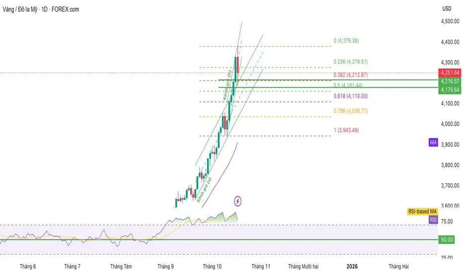 Biểu đồ ngày của vàng vẫn nằm trong xu hướng tăng trung–dài hạn, thể hiện qua việc giá duy trì phía trên đường MA21 và vẫn còn trong kênh tăng (a) dù vừa điều chỉnh. Sau khi đạt đỉnh lịch sử 4.379, giá đã giảm về quanh vùng 4.250 USD/ ounce, tương ứng mức thoái lui Fibonacci 0.382.