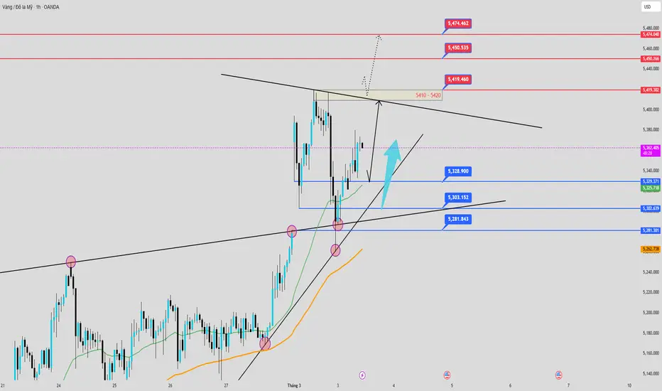 - Vùng (5410 - 5420) là kháng cự quyết định cho nhịp tăng tiếp theo. Break vùng này sẽ mở rộng đà tăng lên 545x - 547x. Khi nến xác nhận phá vỡ (5450 - 5452) xu hướng sẽ bước vào pha tăng mạnh và mở rộng đà tăng hơn.