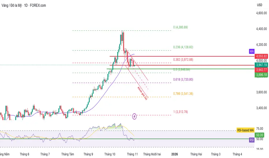 Về cấu trúc kỹ thuật, vùng Fibonacci 0,382 tại 3.972 Dollar ounce vẫn là ngưỡng kháng cự quan trọng, trong khi mức 3.896 Dollar (Fibo 0,5) đóng vai trò hỗ trợ trung hạn. Đường trung bình MA21 hiện ở quanh 4.055 Dollar, tạo rào cản động phía trên, phản ánh đà giảm ngắn hạn vẫn chiếm ưu thế. Chỉ báo RSI duy trì dưới ngưỡng 50, cho thấy thị trường vẫn trong trạng thái tích lũy, thiếu động lượng rõ ràng.