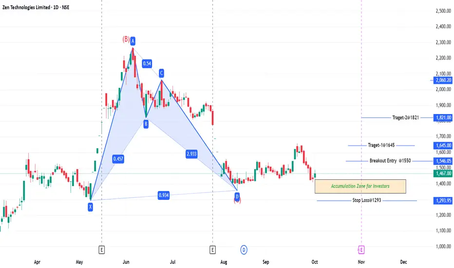 Based on a comprehensive technical analysis of Zen Technologies Limited (ZENTEC), the stock is currently positioned at a critical juncture, with both Elliott Wave theory and the Bat Harmonic pattern indicating potential trading opportunities.
